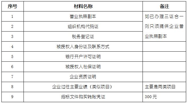 2、 凡有意向参加投标者,请在上述期间内按下表提供报名资料,相关证明文件的原件如无法提供原件则提供复印件加盖公司公章,投标人须将上述资料的扫描件发邮件至招标联系人处进行报名。