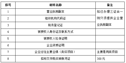 2、 凡有意向参加投标者,请在上述期间内按下表提供报名资料,相关证明文件的原件如无法提供原件则提供复印件加盖公司公章,投标人须将上述资料的扫描件发邮件至招标联系人邮箱进行报名。