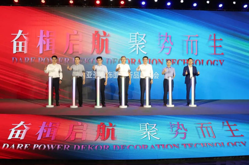 伴随着掌声和倒计时,发布会迎来了高光时刻。陈建军董事长、周鸿升司长、陈天全秘书长、眭敏总、吴谷华总、刘海涛总、马龙总共同上台按下启航按钮,大亚圣象饰面板新品正式发布。