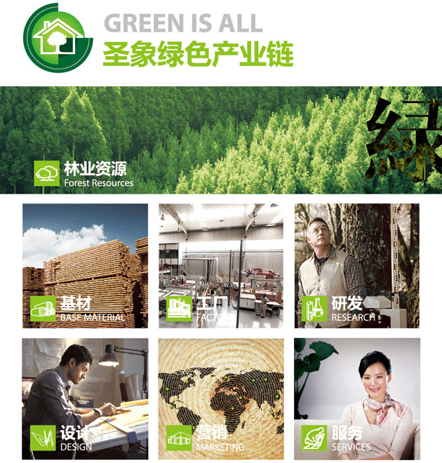 圣象绿色产业链是圣象品牌最重要的企业战略之一,也是圣象长期引以为荣并长期坚持恪守的绿色方案和发展根基。圣象将可持续发展理念纵向贯通于产业链上下游,涵盖林业资源、基材、工厂、研发到设计、营销、服务7大环节,形成一个全面完整的品质质控体系。