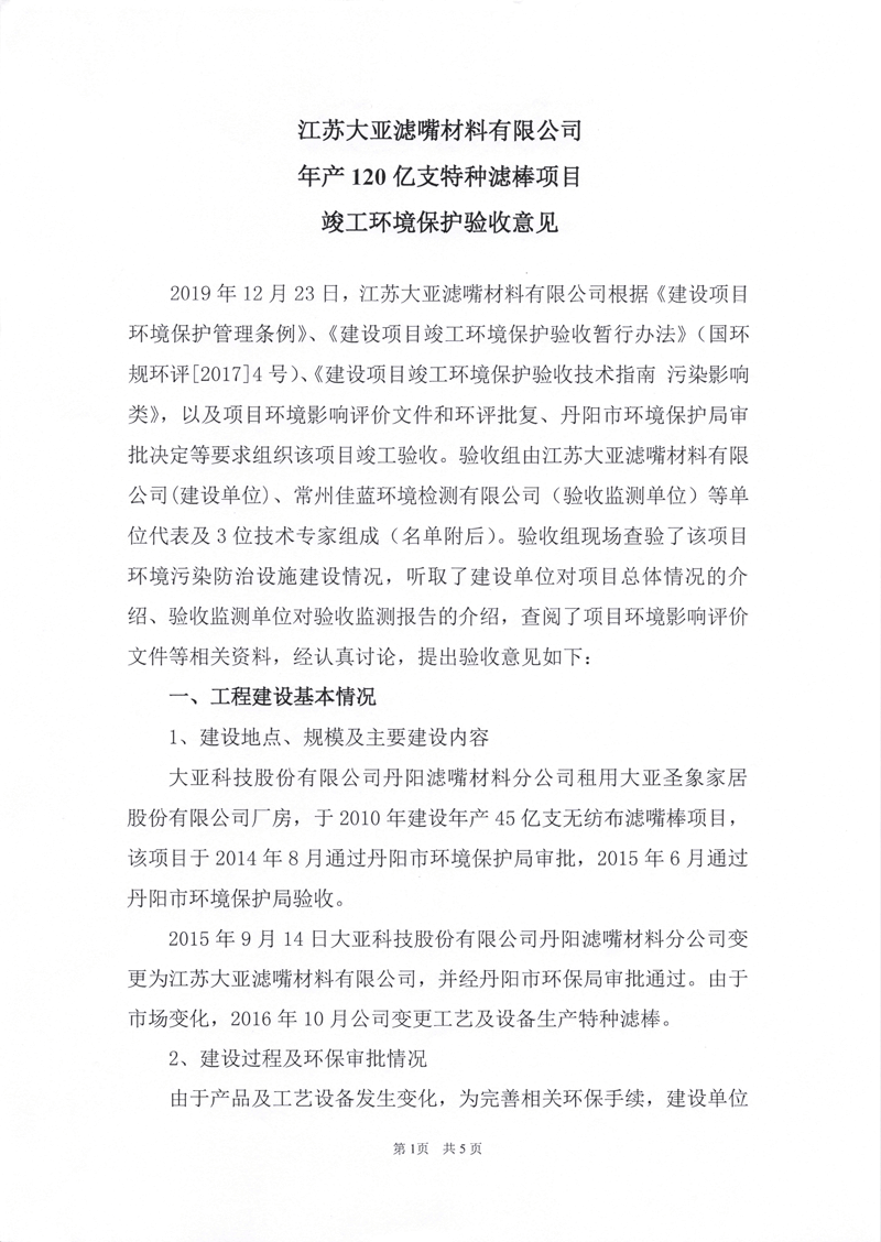 根据《国务院关于修改<建设项目竣工环境保护管理条例>》(国务院令第682号)以及环保部《关于发布<建设项目竣工环境保护验收暂行办法>的公告》(国环规环评(2017)4号),现将江苏大亚滤嘴材料有限公司年产120亿支特种滤棒项目环境保护验收内容(包括验收监测报告、验收意见)公示如下: