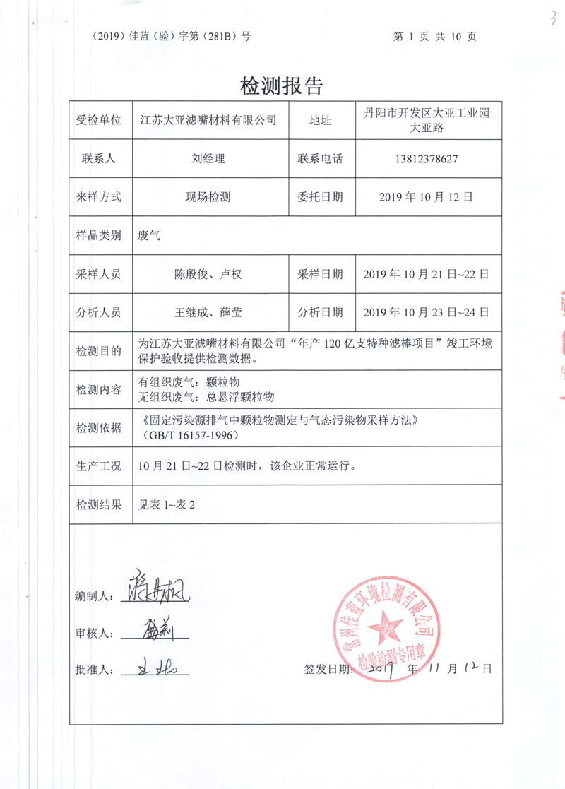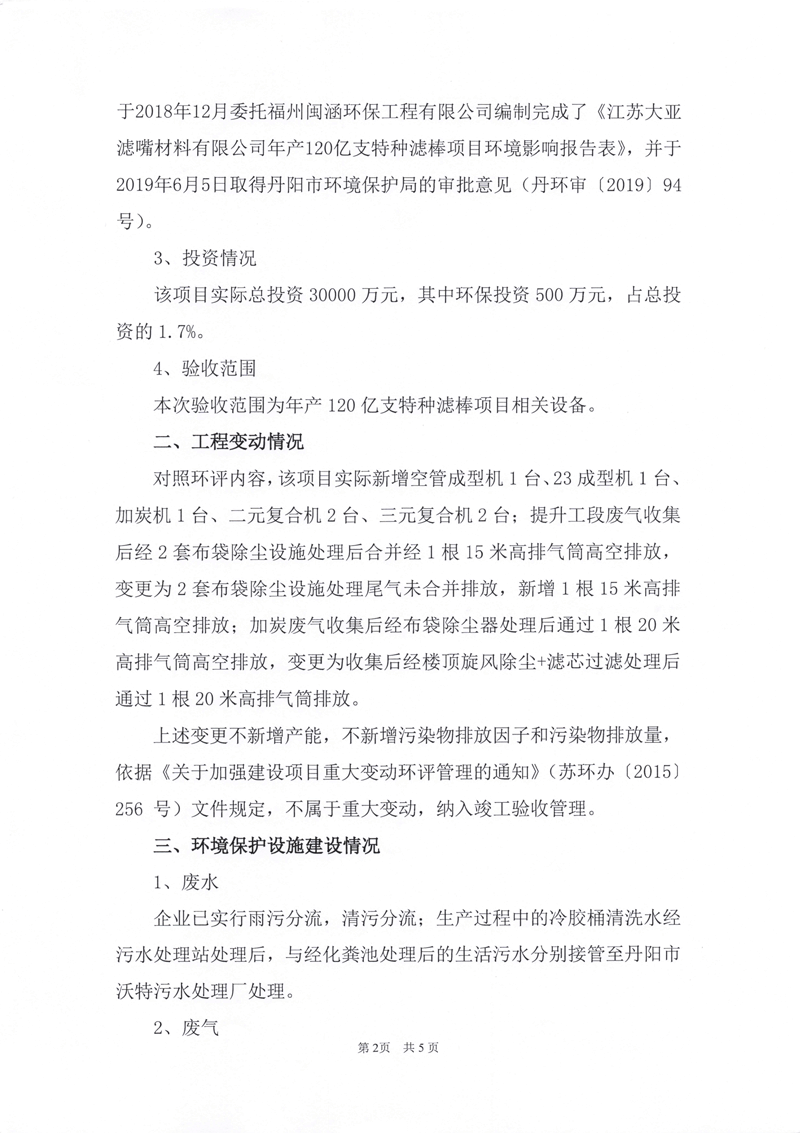 江苏大亚滤嘴材料有限公司年产120亿支特种滤棒项目环境保护验收监测情况自主公示